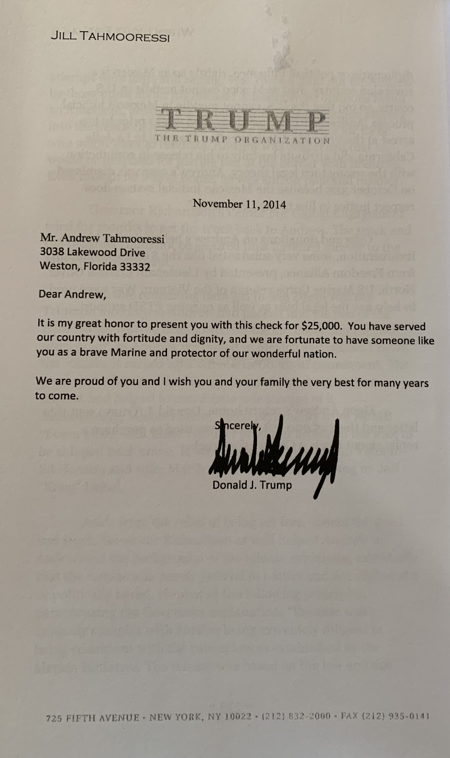 Tahmooressi’s mother Jill, who was a vocal and persistent advocate for her son’s release and return to the United States, confirmed in a phone call with Snopes that Trump had indeed sent Andrew a check for $25,000 after he was released in late 2014. Trump also enclosed a letter, which Tahmooressi reproduced in her memoir. In that letter, dated Nov. 11, 2014, Trump wrote: