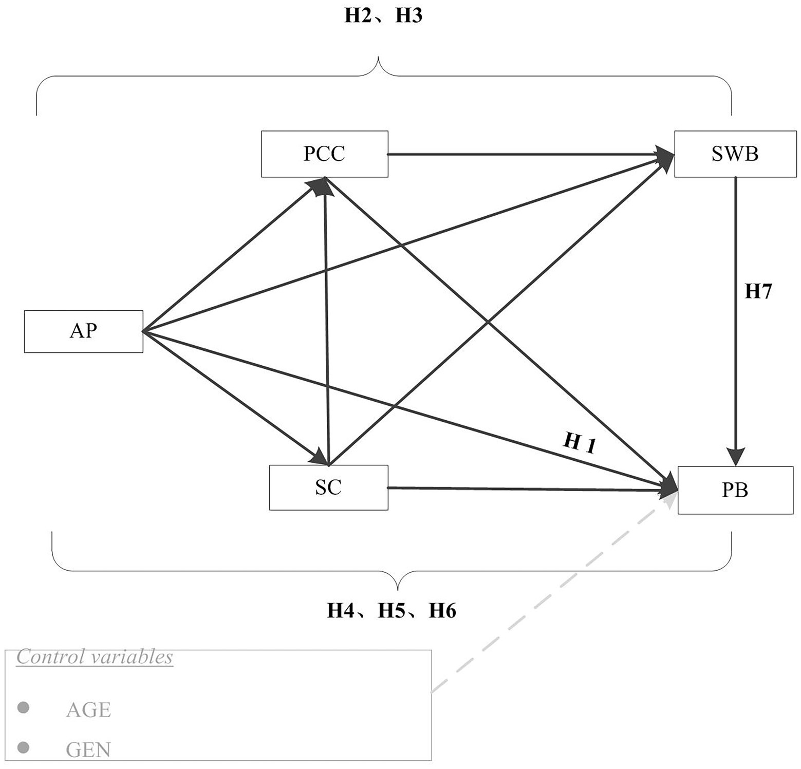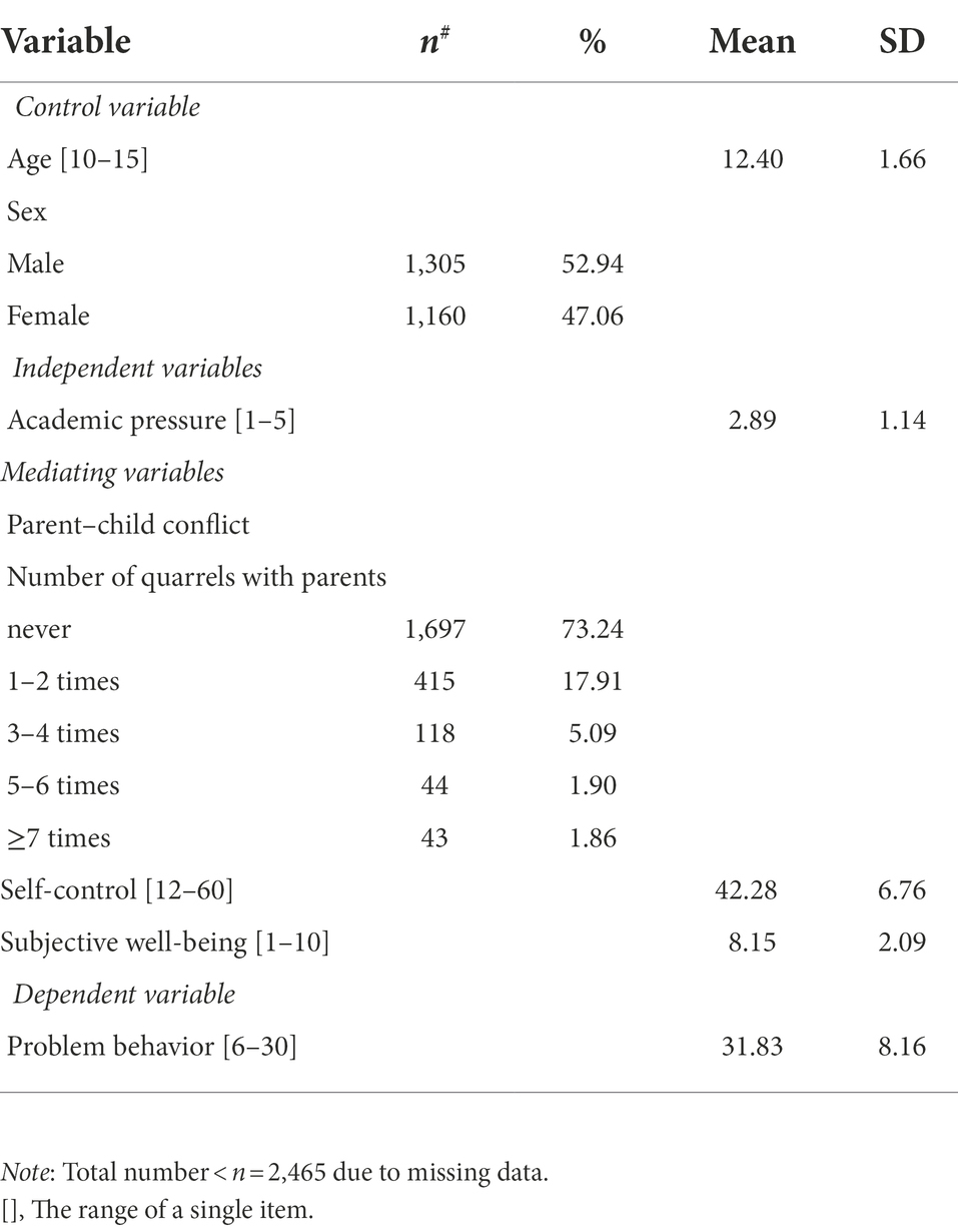 AP, Academic pressure; SC, Self-control; PCC, Parent–child conflict; SWB, Subjective well-being; PB, Problem behavior; CFA, Confirmatory factor analysis; SD, Standard deviation; SEM, Structural equation modeling.