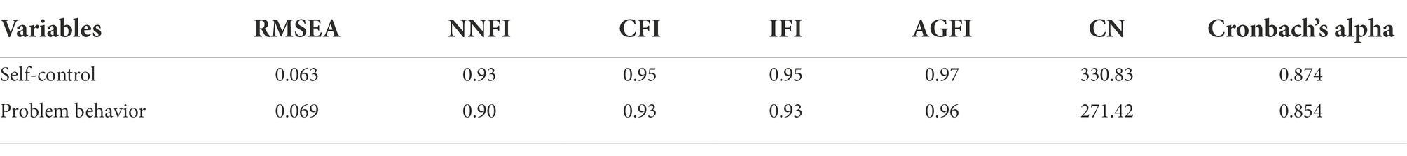 LISREL 8.8 software was used to perform confirmative factor analysis of the measurement indicators. The analysis results are shown in the following table. The RMSEA values of self-control and behavioral deviation are all less than 0.08, the values of NNFI, CFI, IFI, and AGFI are all greater than 0.9, the Cronbach’s alpha values are all greater than 0.7, and the reliability and validity of the scale are within the acceptable range (Table 2).