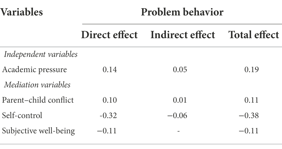 Table 5 shows the path of influence between academic pressure and adolescents’ problem behavior. The study found that academic pressure has a significant influence on adolescents’ problem behavior, with a total effect of 0.19 (p < 0.001) and a direct effect of 0.14 (p < 0.001). Hypothesis 1 is supported by the data. Academic pressure has a positive impact on parent–child conflict (β = 0.09, p < 0.001), and parent–child conflict also has a direct impact on adolescents’ problem behavior (β = 0.10, p < 0.01). It has a significant negative effect on subjective well-being (β = −0.07, p < 0.001), and subjective well-being can directly affect adolescents’ problem behavior (β = −0.11, p < 0.001). Therefore, academic pressure can positively affect adolescents’ problem behavior through parent–child conflict, and it can also affect adolescents’ problem behavioral through parent–child conflict and subjective well-being. Hypotheses 2, 3, and 7 are supported to some extent. In addition, academic pressure negatively affects self-control (β = −0.09, p < 0.001), while self-control directly affects adolescents’ parent–child conflict, subjective well-being, and problem behavior, with direct effects of −0.18, 0.37, and −0.32, respectively (p < 0.001). Therefore, academic pressure can affect adolescents’ problem behavior through self-control. The deviant behavior of teenagers can be influenced through self-control and parent–child conflict, but also through self-control, parent–child conflict, and subjective well-being. Therefore, hypotheses 4, 5, and 6 are supported to some extent.